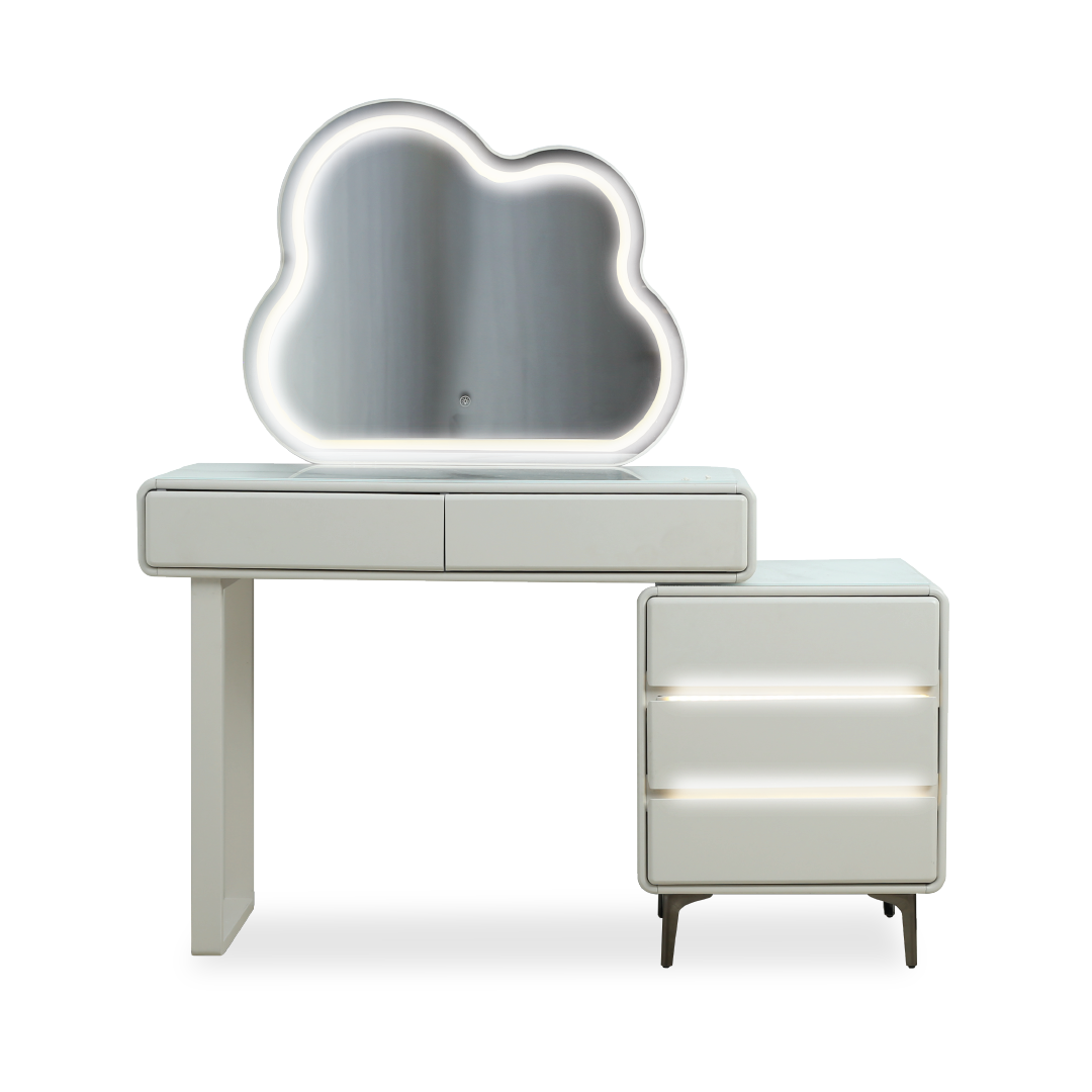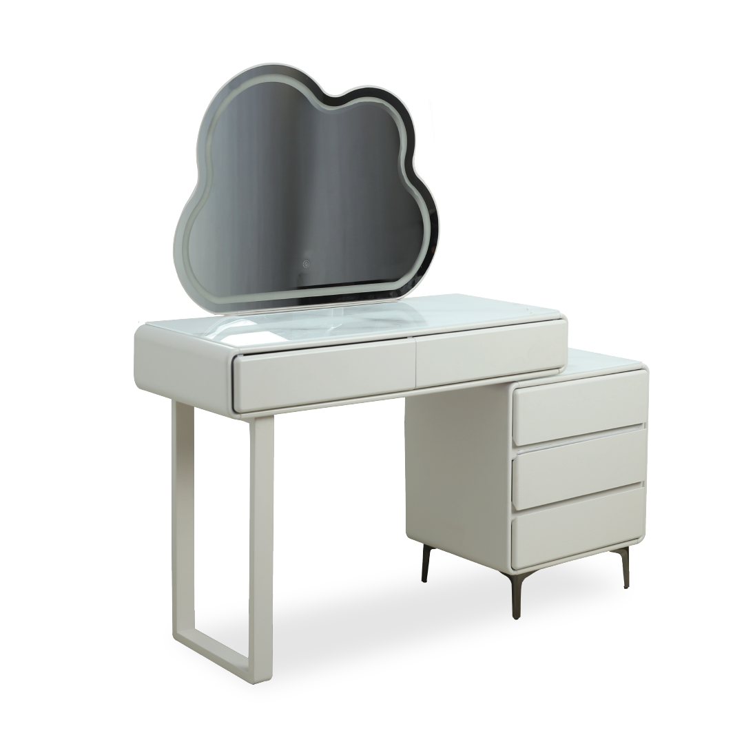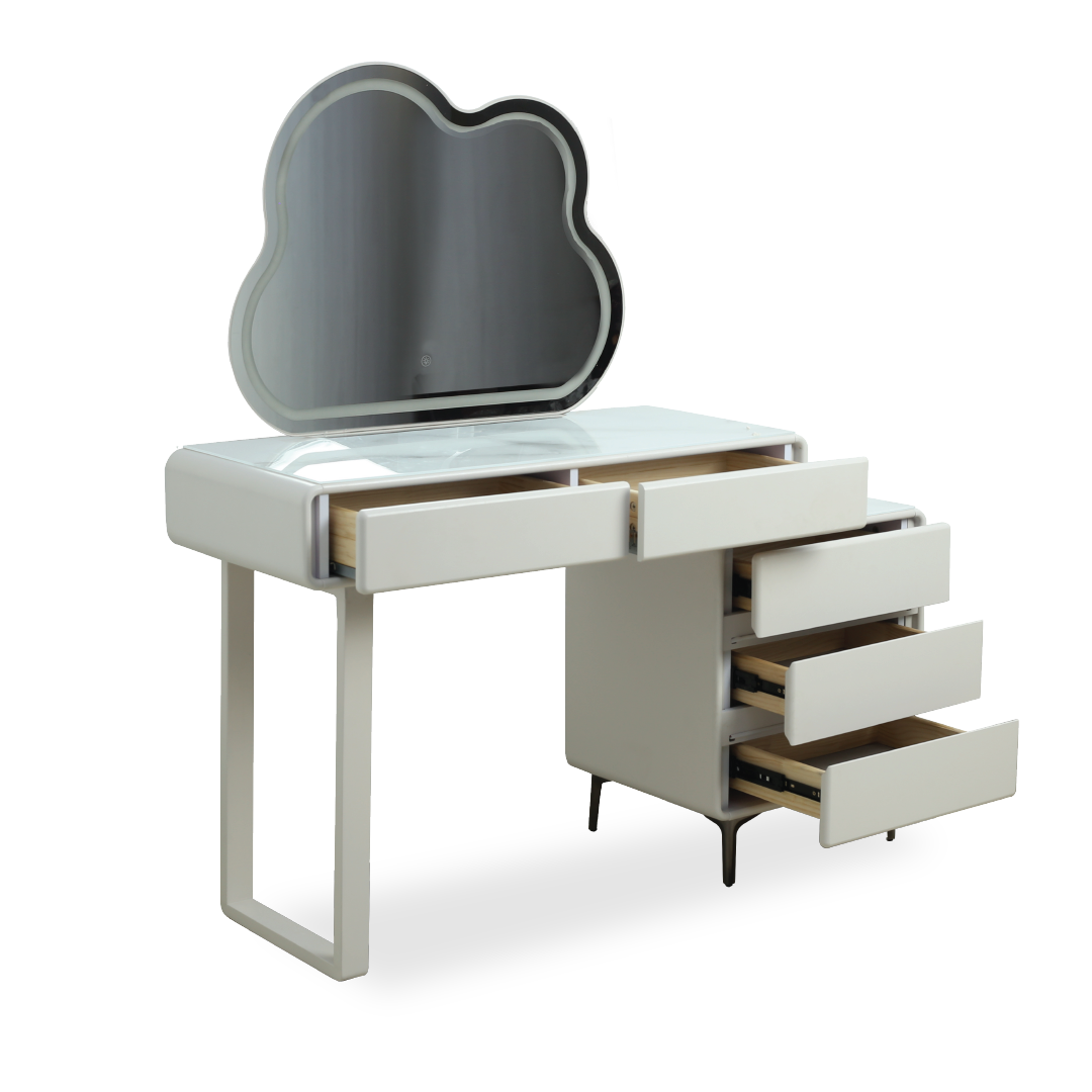 The PANSY Dresser is designed with functionality in mind, featuring a partitioned storage system and full extension silent drawer runners. With a drawer specifically dedicated to jewelry storage and a convenient retractable cabinet for additional items, every piece of makeup or accessory can find its home. Plus, the hollowed-out tempered glass push-to-open drawer eliminates the need for handles, maintaining a sleek silhouette.